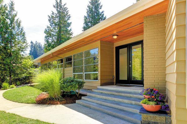 This Modern-style home features a Cambridge Smooth Steel Exterior Door, with a Full Lite door style and Clear glass, prefinished in Symphony – 176, with Georgian Knob hardware in Bright Chrome.