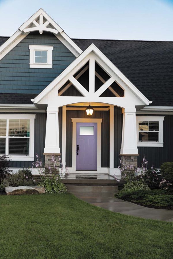 This Craftsman-style home features a Cambridge Smooth Steel Exterior Door, with a Craftsman Lite, 2-Panel door style and Blanca glass, prefinished in Custom Color, with an Addison Handleset in Matte Black.