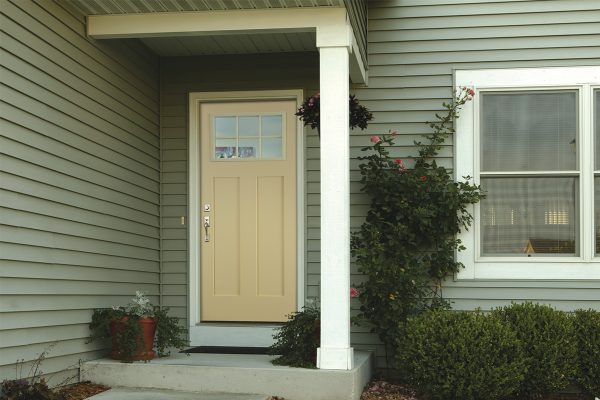 This Craftsman-style home features a Weston Brushed Smooth Fiberglass Exterior Door, with a Craftsman Lite, 2-Panel Flat Shaker door style and Modern Simulated Divided Lite glass, prefinished in French Manor – 164, with Camelot Handleset hardware in Bright Chrome.