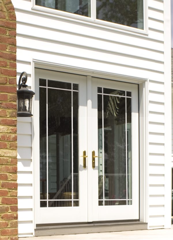 This European-style home features a Weston Brushed Smooth Fiberglass Exterior Door, with a Full Lite door style and Internal Grille – Prairie glass, prefinished in Classic White – 120.