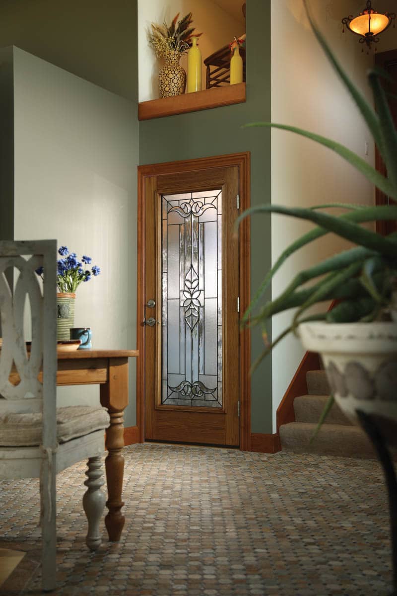 This Traditional-style home features a Timbergrain Fiberglass Exterior Door in Oak, with a Full Lite door style and Canteberry glass, with hardware in Satin Nickel.