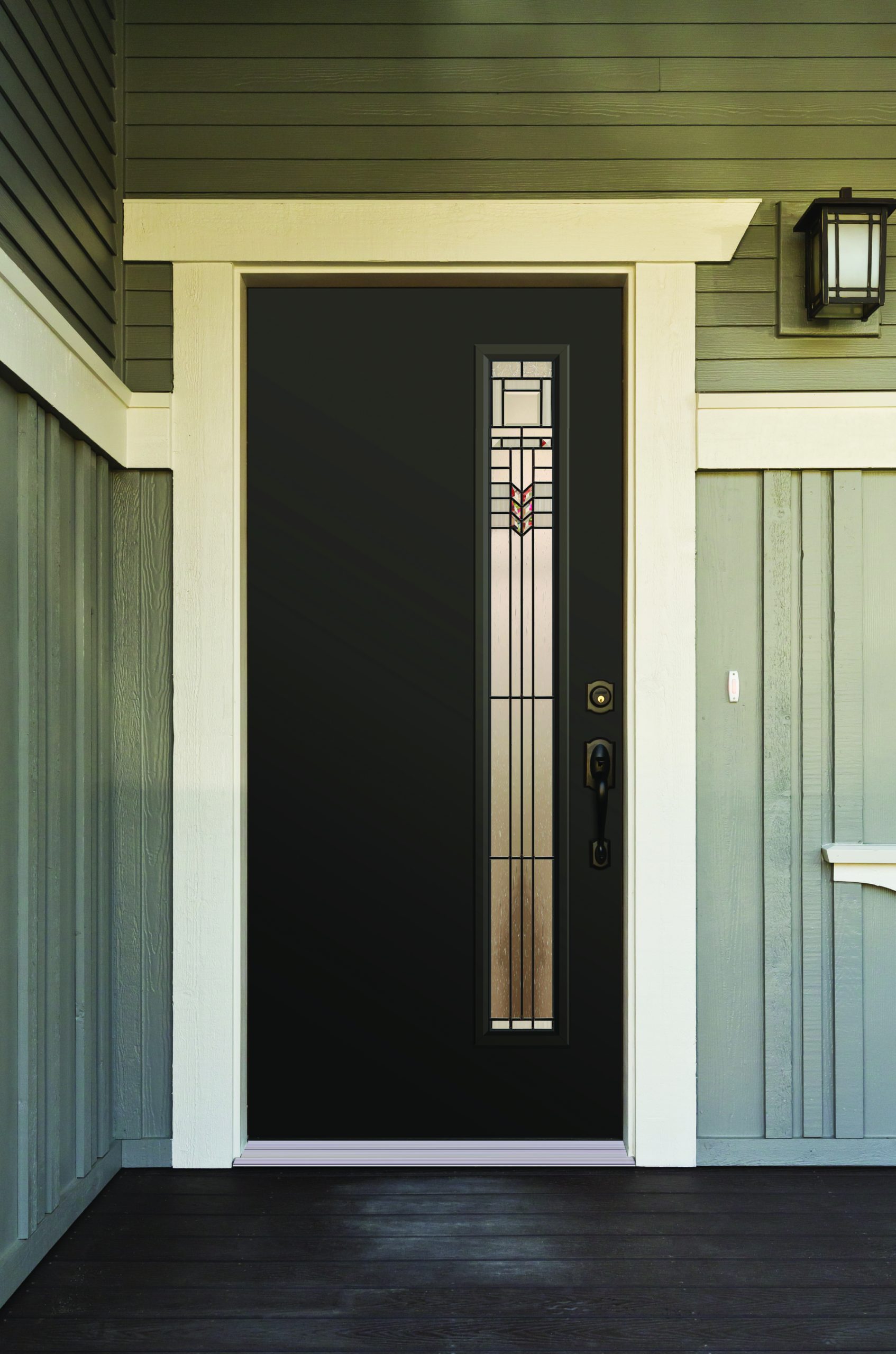 A Traditional-style home featuring a Weston Smooth Brushed Fiberglass Exterior Door, with an Offset Vertical Lite door style and Heartland glass, prefinished in Old World - 132, with a Schlage Camelot handleset in Aged Bronze.