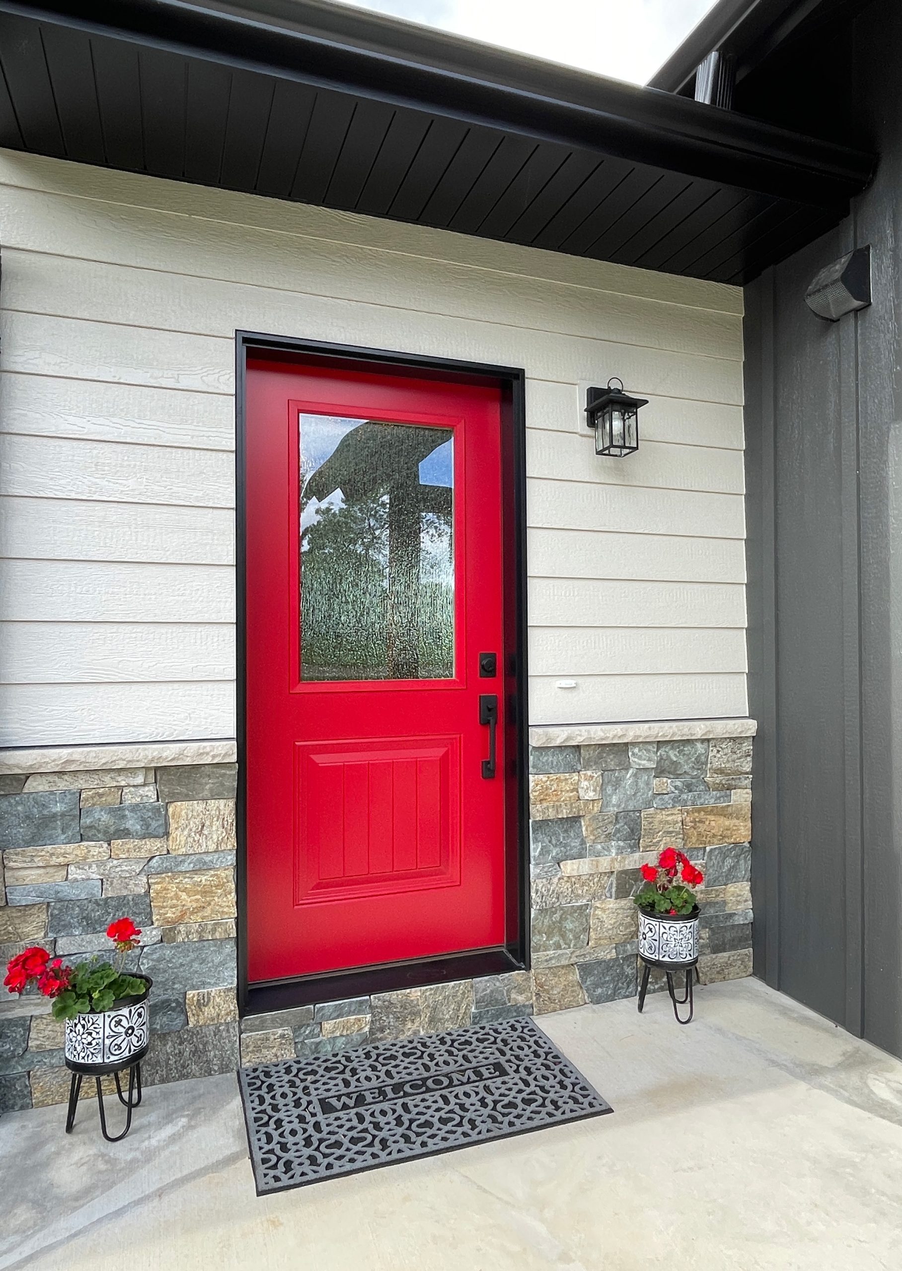 A Modern-style home featuring a Cambridge Smooth Steel Exterior Door, with 1/2 Lite, 2-Panel Plank and Rain glass, prefinished in a Red Velvet – 189, with Schlage Century handleset in Matte Black.