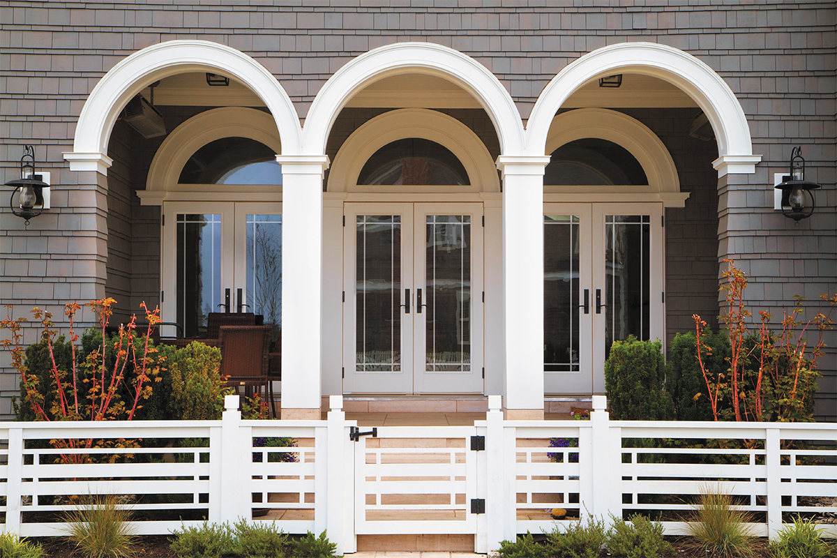 This Traditional-style home features a Cambridge Smooth Steel Exterior Door, with a Full Lite door style and Internal Grille – Prairie glass, prefinished in Classic White – 120.