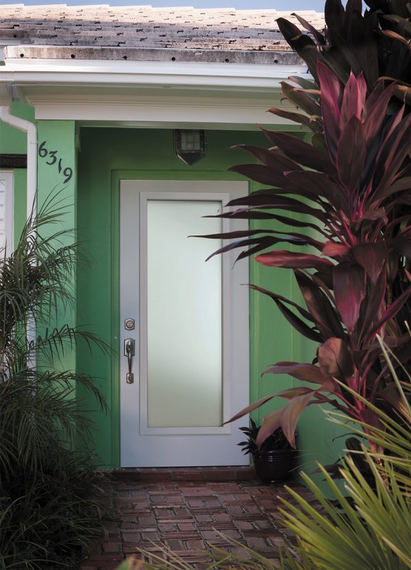 This Southwest-style home features a Weston Brushed Smooth Fiberglass Exterior Door, with a Full Lite door style and Blanca glass, prefinished in Crumb Cake – 107, with Camelot Handleset hardware in Bright Chrome.