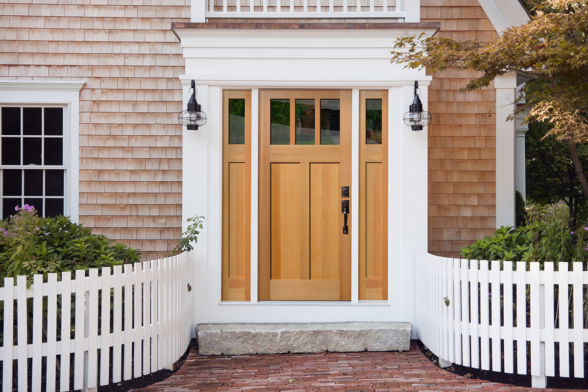 This European-style home features a Heritage Wood Exterior Door, with a Craftsman Lite, 2-Panel door style and True Divided Lite glass.