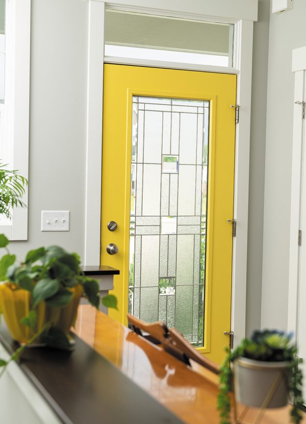 This Eclectic-style home features a Cambridge Smooth Steel Exterior Door, with a Full Lite door style and Monterey glass, prefinished in Happy Days – 181, with Plymouth Knob hardware in Satin Nickel.