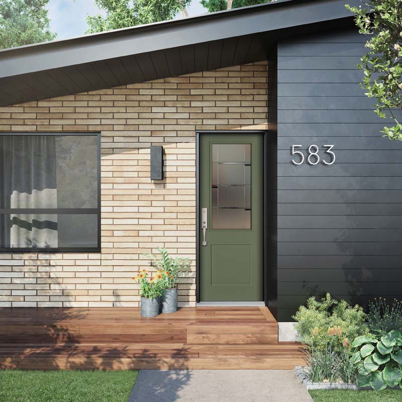 A Midncentury-style home featuring a Cambridge Smooth Steel Exterior Door, in a 1/2 Lite, 1-Panel Flat Shaker door style and Crosswalk glass, prefinished in Fern – 155, and with a Baldwin Del Mar Handleset in Satin Nickel.