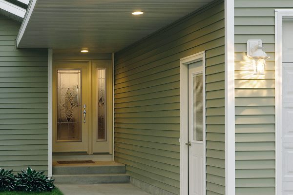 This Traditional-style home features a Weston Brushed Smooth Fiberglass Exterior Door, with a Full Lite door style and Regency glass, prefinished in Shiplap White – 141.