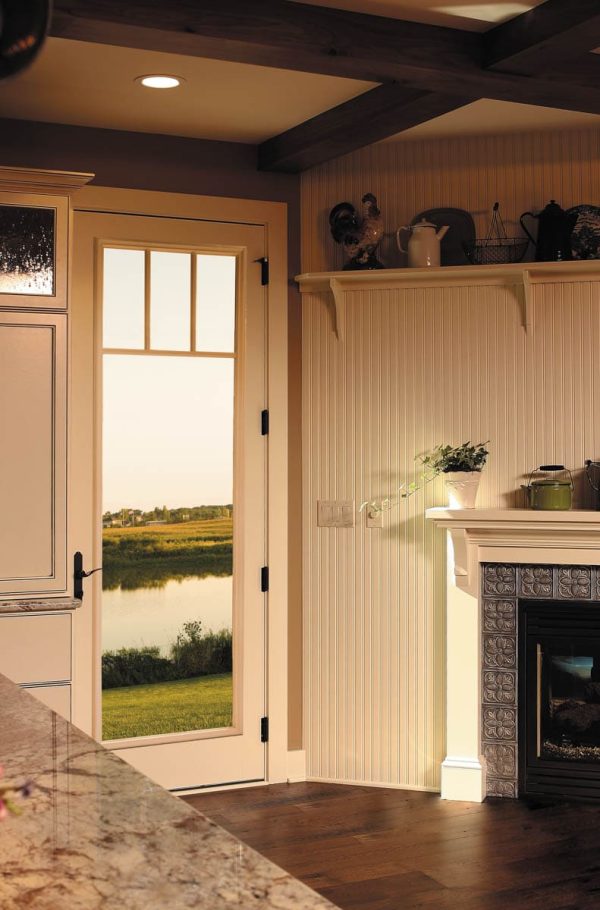 This Farmhouse-style home features a Cambridge Smooth Steel Exterior Door, with a Full Lite door style and Internal Grille – Arts & Crafts glass, prefinished in Shiplap White, with hardware in Matte Black.