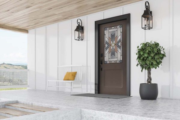 A Farmhouse-style home featuring a Cambridge Smooth Steel Exterior Door, with a 1/2 Lite, 1-Panel Flat Shaker and Mohave glass, prefinished in Noble – 168, and with a Schlage Addison Handleset in Matte Black.