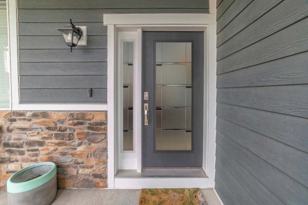 A Craftsman-style home featuring a Cambridge Smooth Steel Exterior Door, with a Full Lite door style and Crosswalk glass, prefinished in a Custom Color.