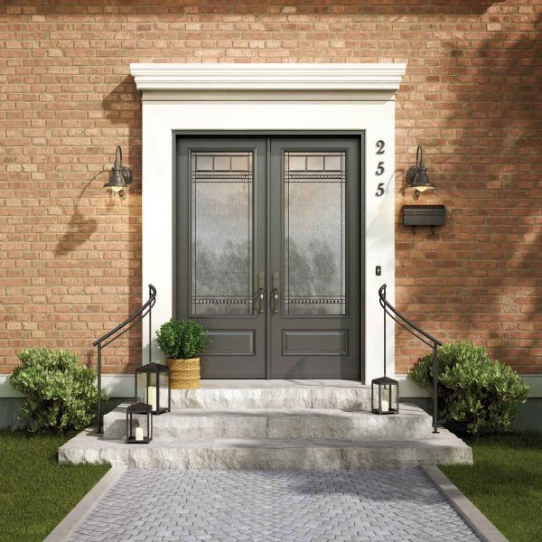 This Industrial-style home features a Cambridge Smooth Steel Exterior Door, with a 3/4 Lite, 1-Panel door style and Brownstone glass, prefinished in Flannel Gray.