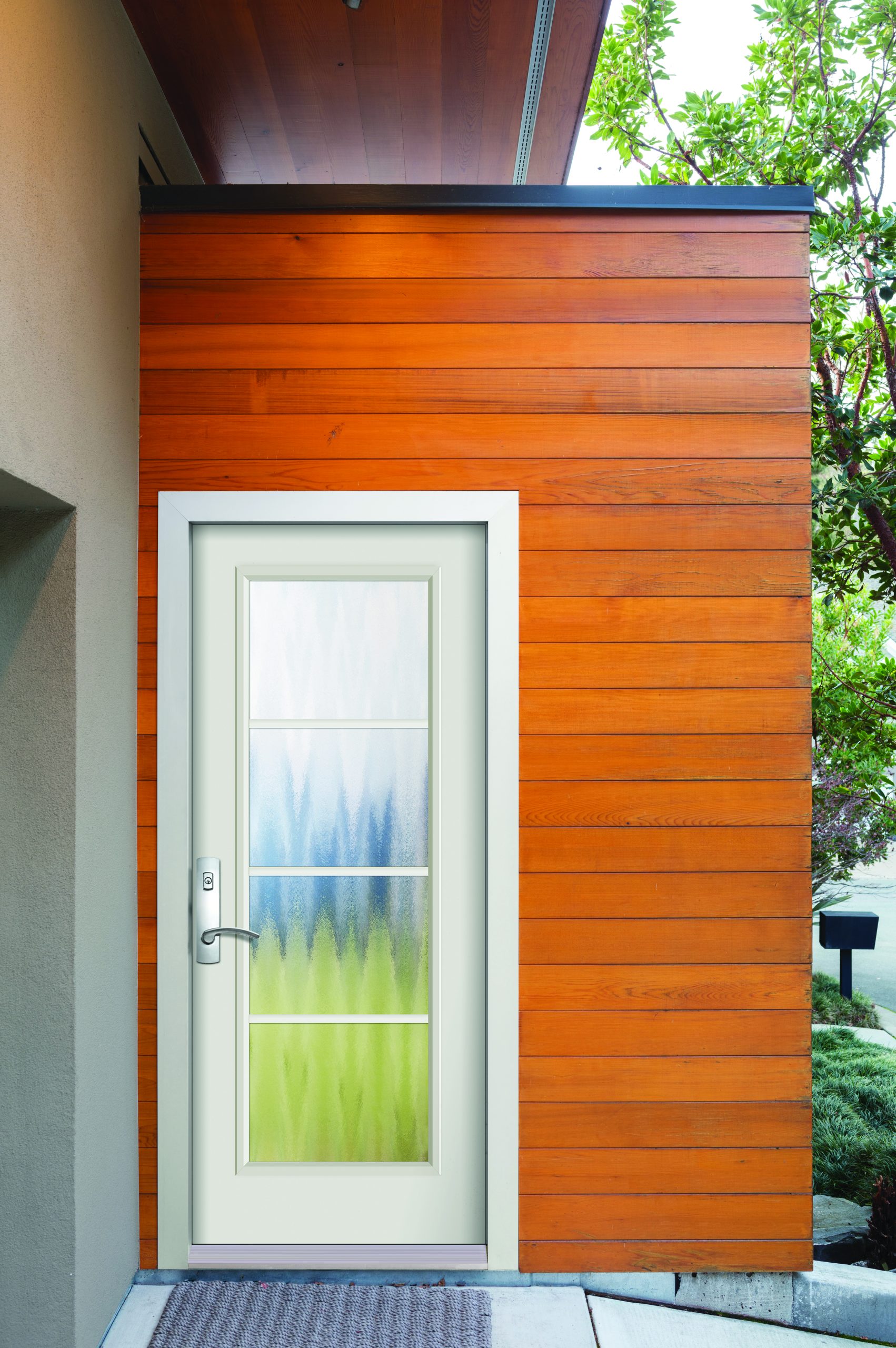 This Modern-style home features a Cambridge Smooth Steel Exterior Door, with a Full-Lite door style and Modern Narrow Simulated Divided Lite and Chinchilla glass, prefinished in Shiplap White – 141, and with an Endura Curved Handleset in Satin Nickel
