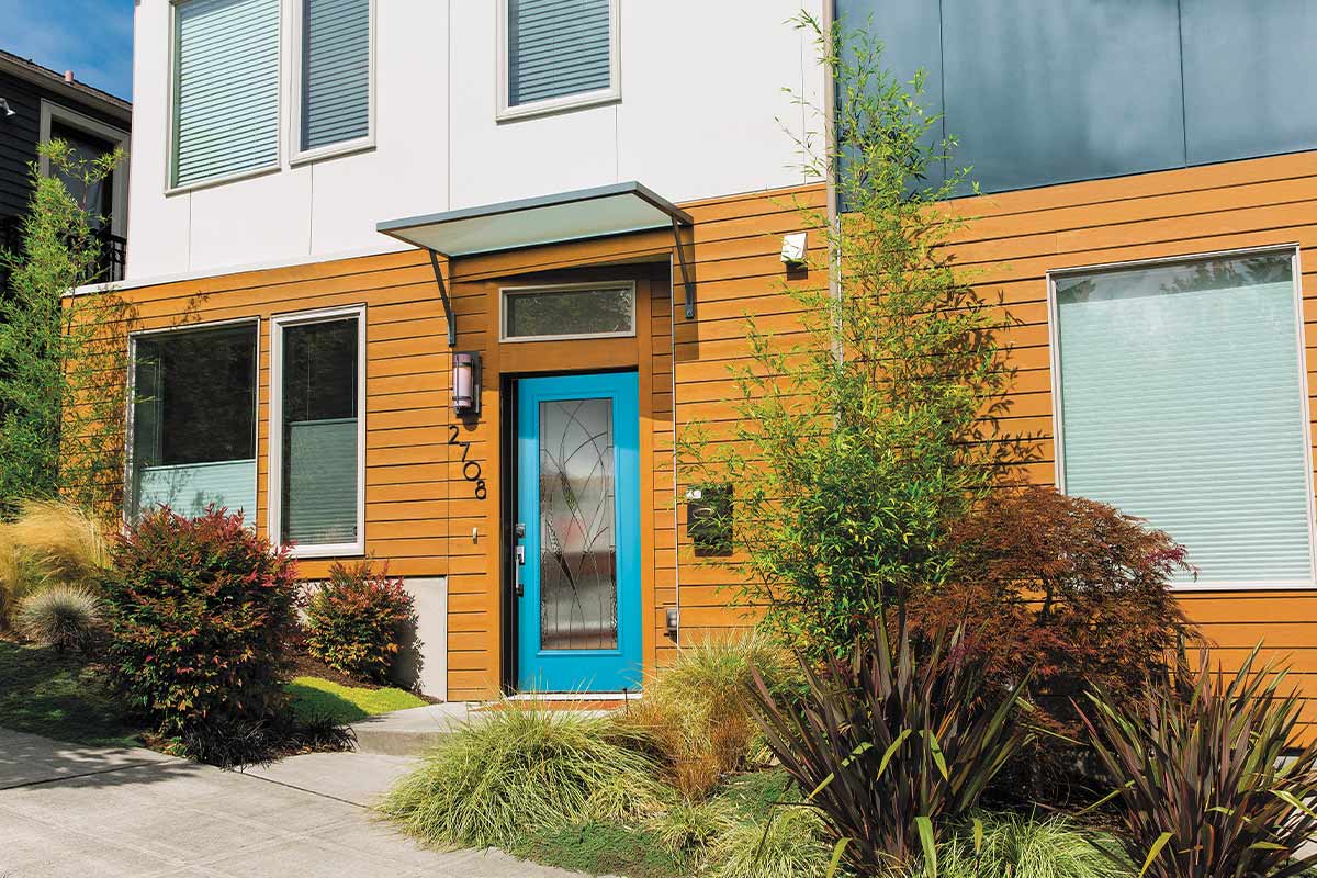 This Eclectic-style home features a Cambridge Smooth Steel Exterior Door, with a Full Lite door style and Waterside glass, prefinished in Wanderlust – 187, with hardware in Satin Nickel.