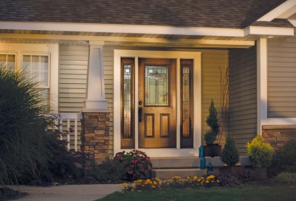 This Craftsman-style home features a Timbergrain Fiberglass Exterior Door in Oak, with a 1/2 Lite, 2 Panels door style and Heartland glass, with a Camelot Handleset in Aged Bronze.