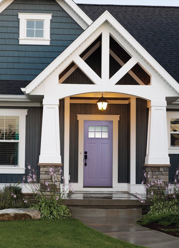 This Craftsman-style home features a Cambridge Smooth Steel Exterior Door, with a Craftsman Lite, 2-Panel door style and Modern Simulated Divided Lite glass, prefinished in Custom Color, with Addison Handleset hardware in Matte Black.