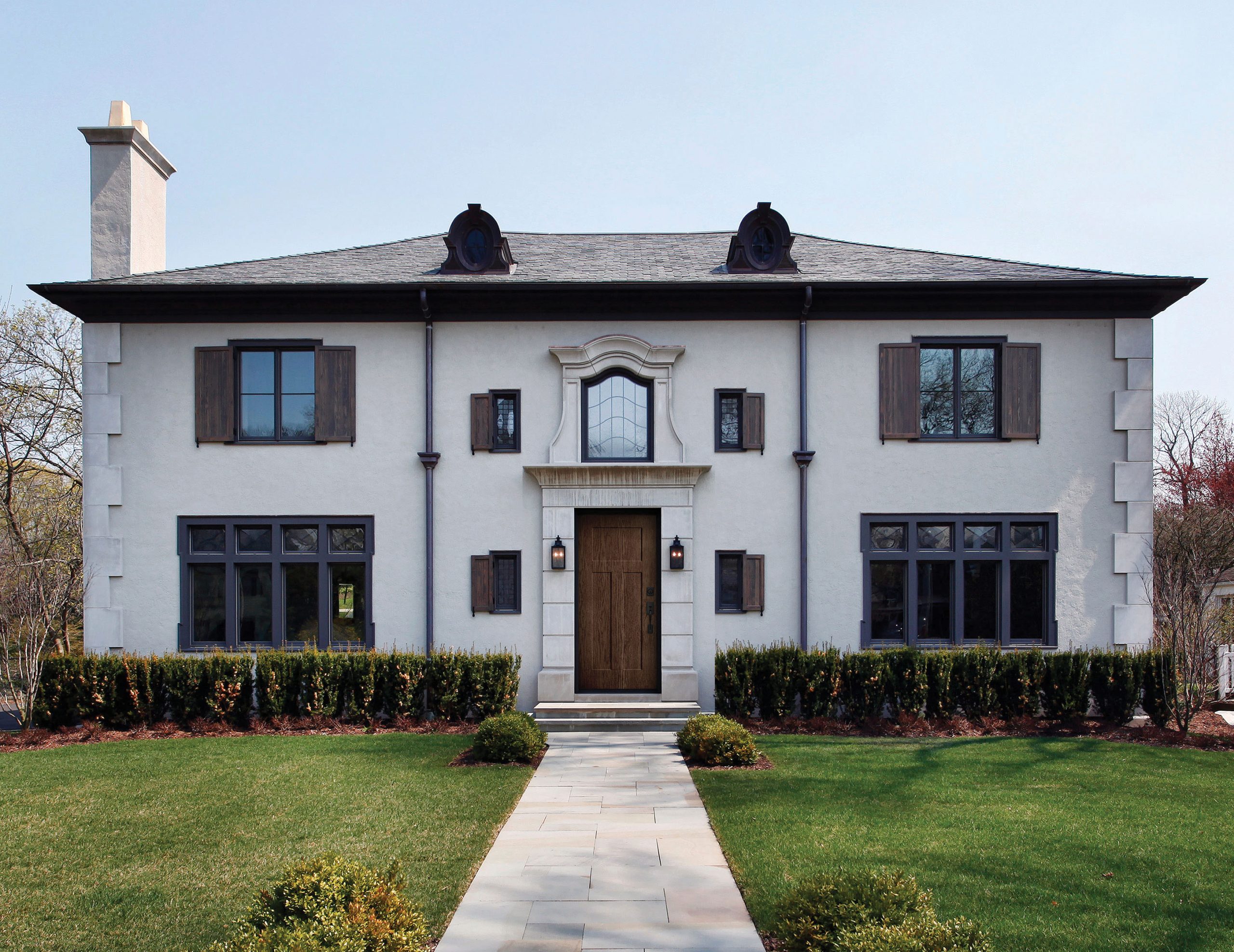 This Colonial-style home features a Norwood Textured Steel Exterior Door, with a 3-Panel Flat Shaker door style, and Schlage Addison hardware in Matte Black.