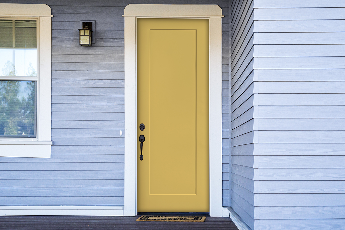 This Modern-style home features a Cambridge Smooth Steel Exterior Door, with a 1-Panel Flat Shaker door style, prefinished in Summer Day – 147, with Plymouth Handleset hardware in Matte Black.