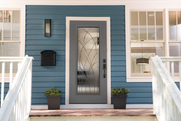 This Traditional-style home features a Cambridge Smooth Steel Exterior Door, with a Full Lite door style and Waterside glass, prefinished in Flannel Gray – 153, with hardware in Matte Black.