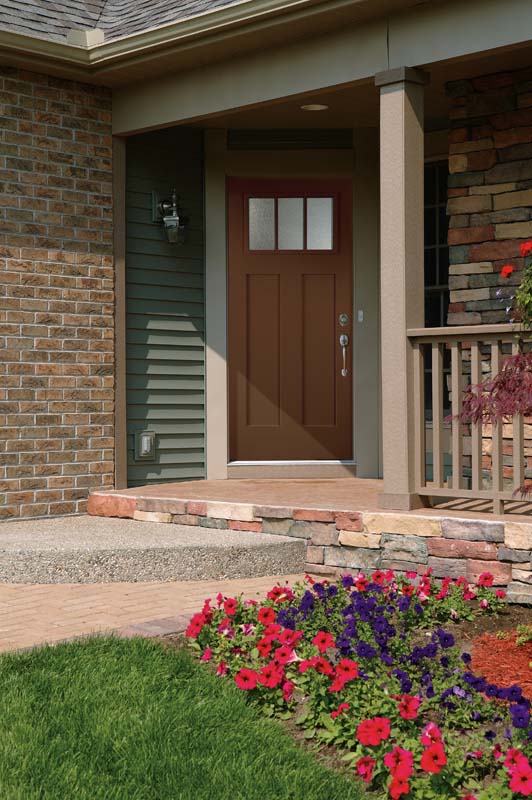 This Traditional-style home features a Weston Brushed Smooth Fiberglass Exterior Door, with a Craftsman Lite, 2-Panel Flat Shaker door style and Modern Narrow Simulated Divided Lite, Micro-Granite Glass, prefinished in Gathering Place - 117, and with a Schlage Plymouth Handleset in Satin Nickel.