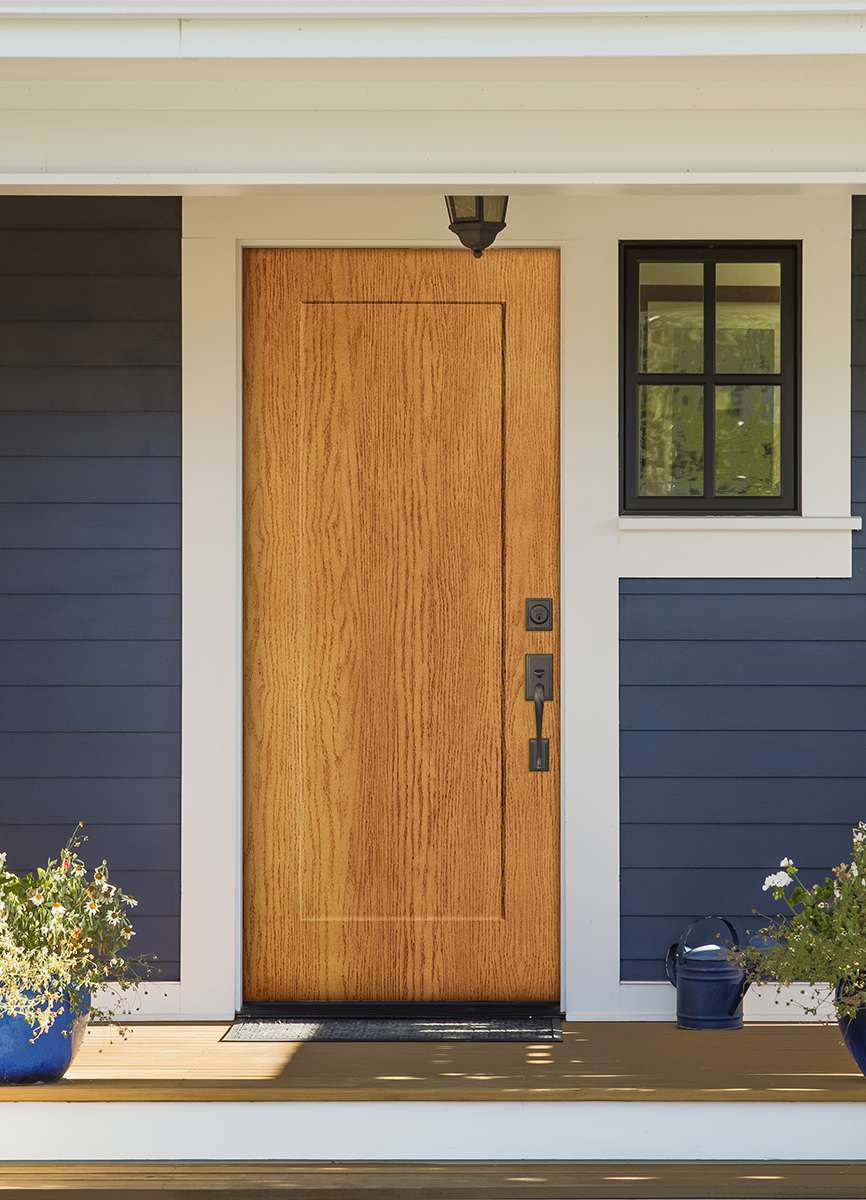 This Rustic-style home features a Norwood Textured Steel Exterior Door, with a 1-Panel Flat Shaker door style, and Addison Handleset hardware in Matte Black.
